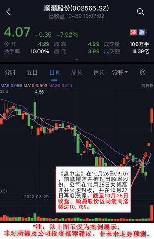 此外,栏目前瞻覆盖并梳理出顺灏股份,公司在10月26日大幅高开并火速封板,并在10月27日再度涨停。截至10月28日收盘,顺灏股份2日最高涨幅达10.78%。