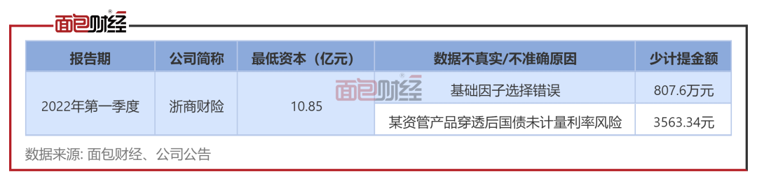 2022年1季度偿付能力报告中,浙商财险未按规定计提最低资本上存在两个问题,其中涉及金额较大的问题是,浙商财险计算存款的交易对手违约风险最低资本时基础因子选择错误,导致少计提最低资本807.6万元。