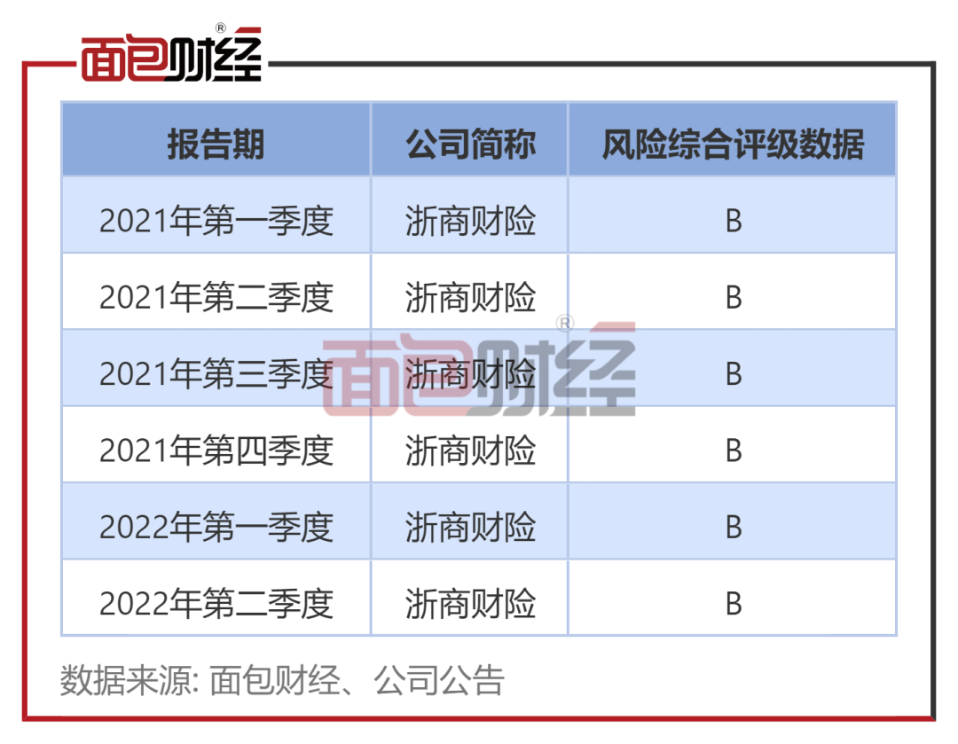 相关公告显示,2021年1季度至2022年2季度偿付能力报告中,浙商财险风险综合评级均为B,已处于监管标准最低要求级别。而目前浙商财险存在部分风险综合评级数据不实的情况,或将影响其未来评级,存在一定不满足监管标准的风险。