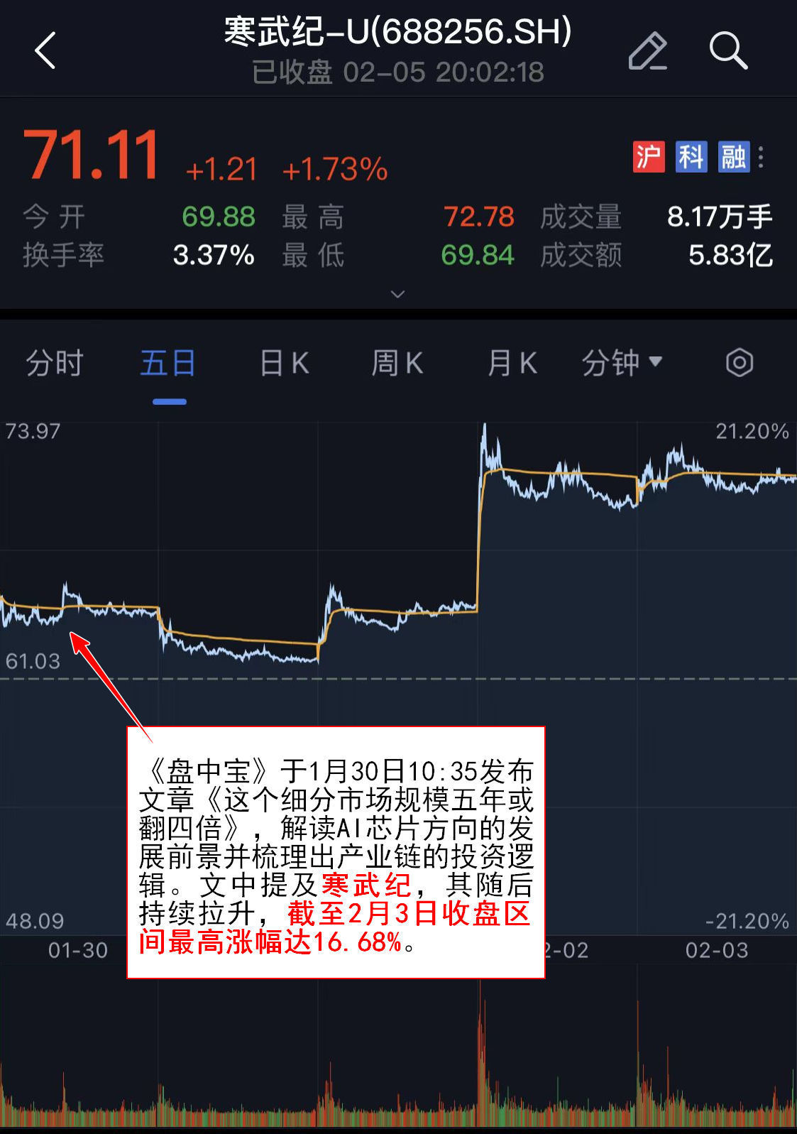 A股上市公司中,寒武纪主营业务是应用于各类云服务器、边缘计算设备、终端设备中人工智能核心芯片的研发、设计和销售,为客户提供丰富的芯片产品。其随后持续拉升,截至2月3日收盘区间最高涨幅达16.68%。