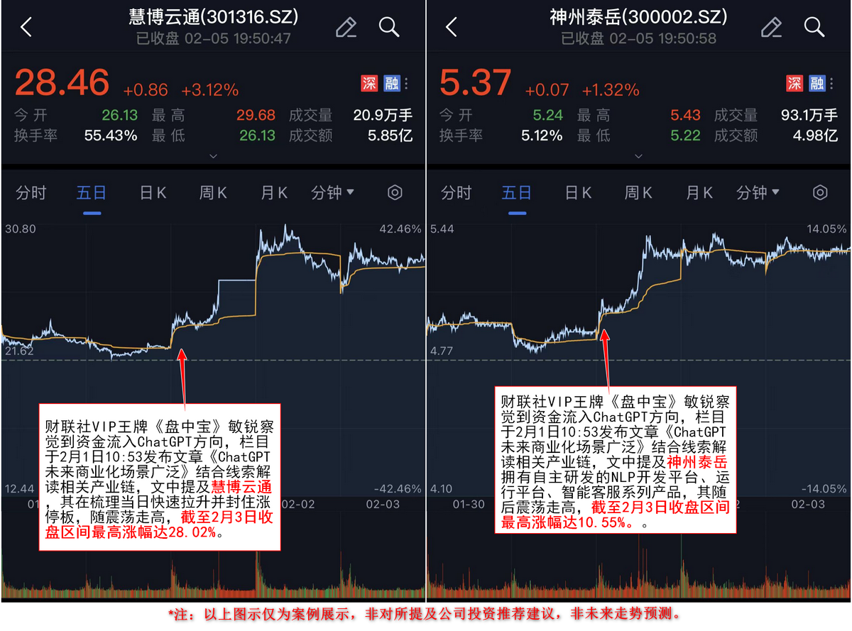 文章梳理出ChatGPT产业链上多家上市公司,其中,神州泰岳拥有自主研发的NLP开发平台、运行平台、智能客服系列产品,其随后震荡走高,截至2月3日收盘区间最高涨幅达10.55%。