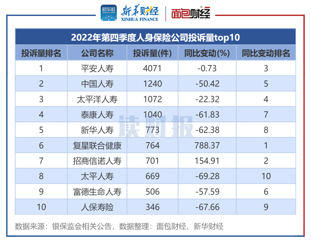 2022年第四季度,人身保险公司中,平安人寿、中国人寿、太平洋人寿、泰康人寿和新华人寿的投诉量排名前五,5家公司的投诉量分别为4071件、1240件、1072件、1040件和773件。值得注意的是,这五家人身险公司该季度投诉量同比均有所下降。