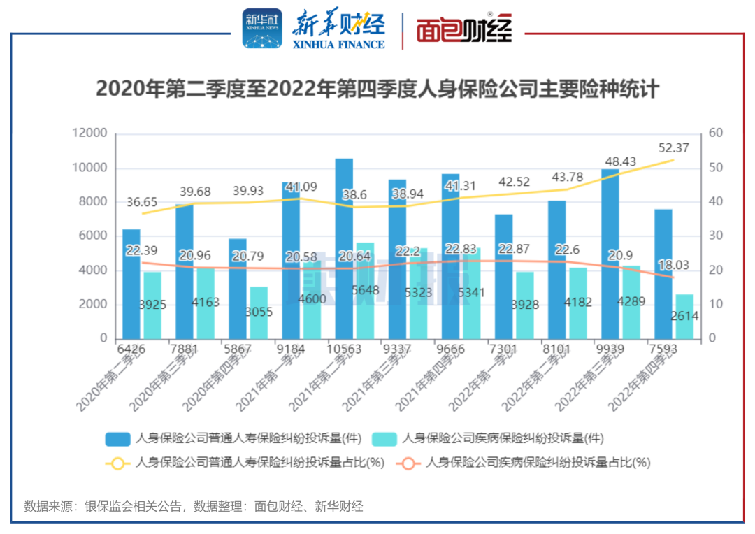 数据显示,2022年第四季度,在涉及人身保险公司投诉中,普通人寿保险纠纷投诉为7593件,较2022年三季度减少2346件,环比下降23.6%;占人身保险公司季度投诉总量的52.37%,较2022年三季度占比增加11.06个百分点。