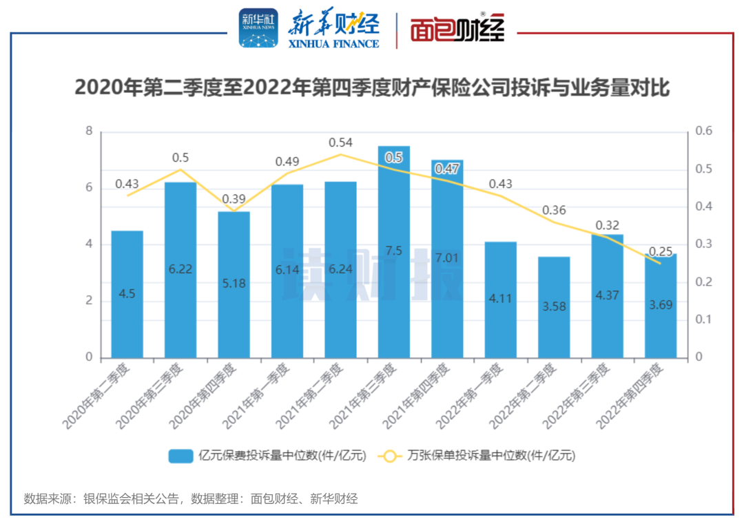 其中,2022年第四季度财产保险公司亿元保费投诉量中位数为3.69件/亿元,较2022年三季度下降0.68件。