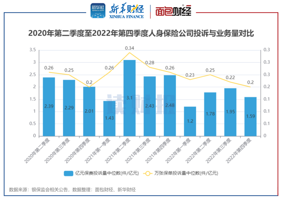 图13:2020年第二季度至2022年第四季度人身保险公司投诉与业务量对比