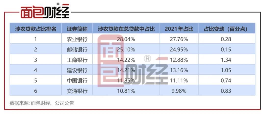 涉农贷款占比:农行最高,交行最低