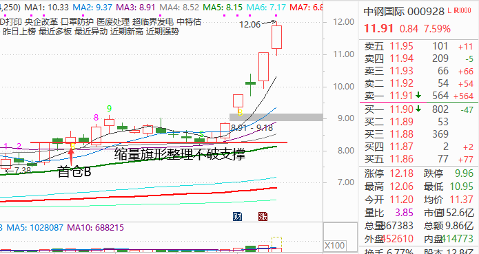 ○今日案例图形学习:000928中钢国际,中特估+一带一路概念,技术上大形态依托60日均线走上升,4月初出现涨停企稳B点出现,此后又小幅缩量回调,但大形态不变,横盘支撑不破可继续谨慎持有,上周四出现突破起涨,短线加速,可成功达成目标。