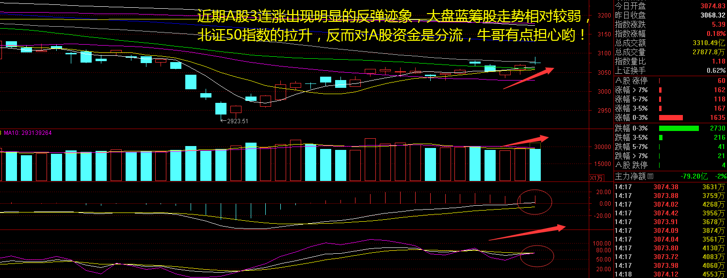 上证指数周二高开后全天震荡为主,在60日线附近上下震荡,出现了明显的波动行情。以目前的市场局势来看,震荡行情为主,其实已经有点开始跟风外盘了,并没有我行我素的往下走,再加上人民币升值带来的资金压力减小,北向资金净流入的比例在加大。以目前的局势来看,A股还是多头趋势为主,就是每天大涨个股不一样,对于心太急的“韭韭们”确实会有点耐受。接下来注意上证指数能否在3070点之上稳住。