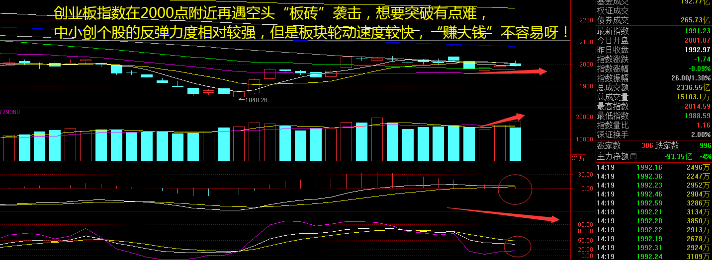 创业板指数周二盘中一度涨逾1%,冲击2000点后出现回落,看来空头在这个位置等待创业板指数的到来。近期中小创个股的反弹机会偏多,一些个股出现了明显的脉冲式上涨,这个位置可以关注大资金的参与方向来进行轮动布局。现阶段与其去追高,不如在超跌股中加仓找机会。接下来注意创业板指数能否在2000点之上稳住。