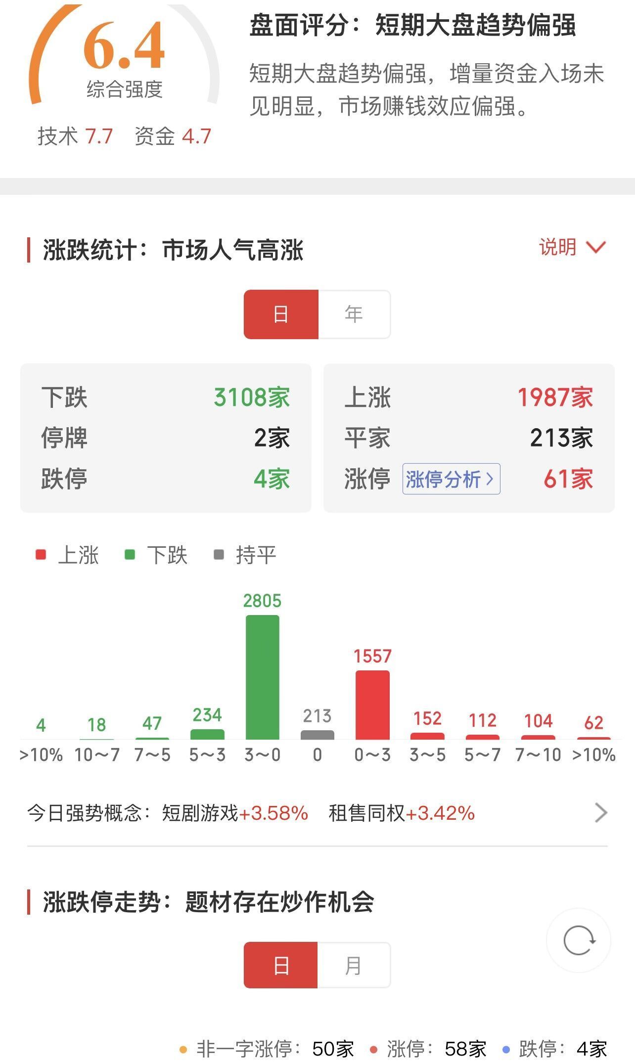 三大指数集体高开,两市个股涨多跌少,题材板块方面房地产、培育钻石、短剧游戏等板块表现较强,电子纸、混合现实、Chiplet等板块表现较差。房地产板块开盘拉升,深振业A涨停,大龙地产、新城控股等多股涨超5%,历时18个月的融创境外债重组正式宣告成功,这意味着融创成为首家完成境内外债务重组所有流程的大型房企。据测算,境内外债务重组完成后,融创整体化解约900亿元人民币的债务风险。短剧概念股继续活跃,引力传媒4连板,岩山科技涨停,天威视讯、唐德影视等纷纷跟涨,短剧的火从去年烧到今年,在横店拍摄剧组累计达470多个,曾经三年没接到戏的导演档期都排到了明年。在短剧通告群里,有过拍摄经验、形象气质良好的群特前景演员的片酬已从200元/天提高到300-400元/天,短剧主角更是提高到8000元/天。