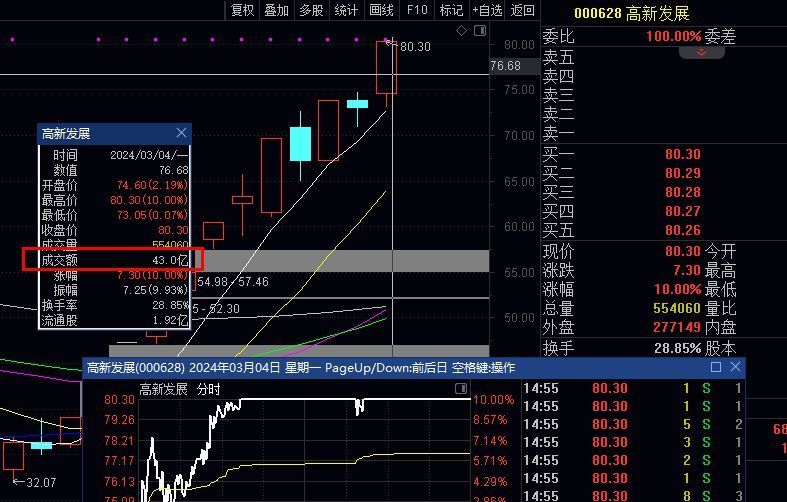 而且成交量大的股,目前看也很容易成为被阻击的对象,比如上图的000628高新发展,今天成交量43亿元,股价80元,跟着大盘低位起来翻 翻股价,这说明年前的那波杀跌是有预谋的,是为市场的选股风格彻底变化的一个打造。
