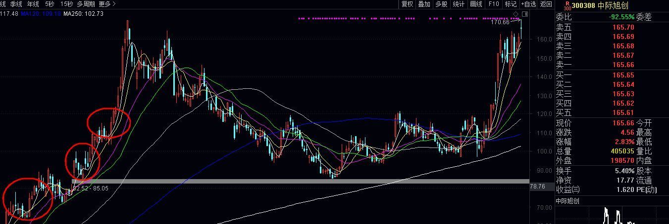 而且今天大盘是二八分化的涨,但是个股普遍涨少跌多,这也是风格变化的一个迹象,而且看上面截图,2023年3月份后面做过几次的,中线战法,300308中际旭创,看截图,居然走出历史新高。170元了,难道主力又要使用中线选股模式来做中线股了?