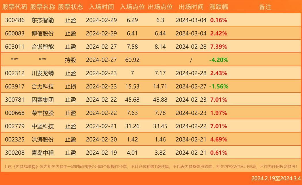 春节后可以发现,这里几乎很少追涨停了,只做过1个,其他的都是潜伏低吸为主,而且好多股都是走早了,有时间盯盘或是分2批的或是加仓补的实际利润不止,比如合力科技是没有开盘前委托涨幅3.5%走的,结果显示止损-1.56%,实际早上1条线大涨到7%,委托早了,不然是可以盈的。还有青岛中程也是,补仓后次日最高涨幅18%也是走早了,还有因赛集团止盈7%结果当天涨停20%等