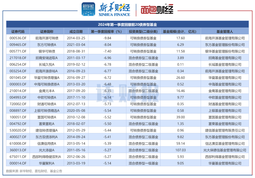 此外,还有银华可转债、招商安瑞进取A、前海开源鼎裕A等多只债券型基金一季度净值回撤超过5%。