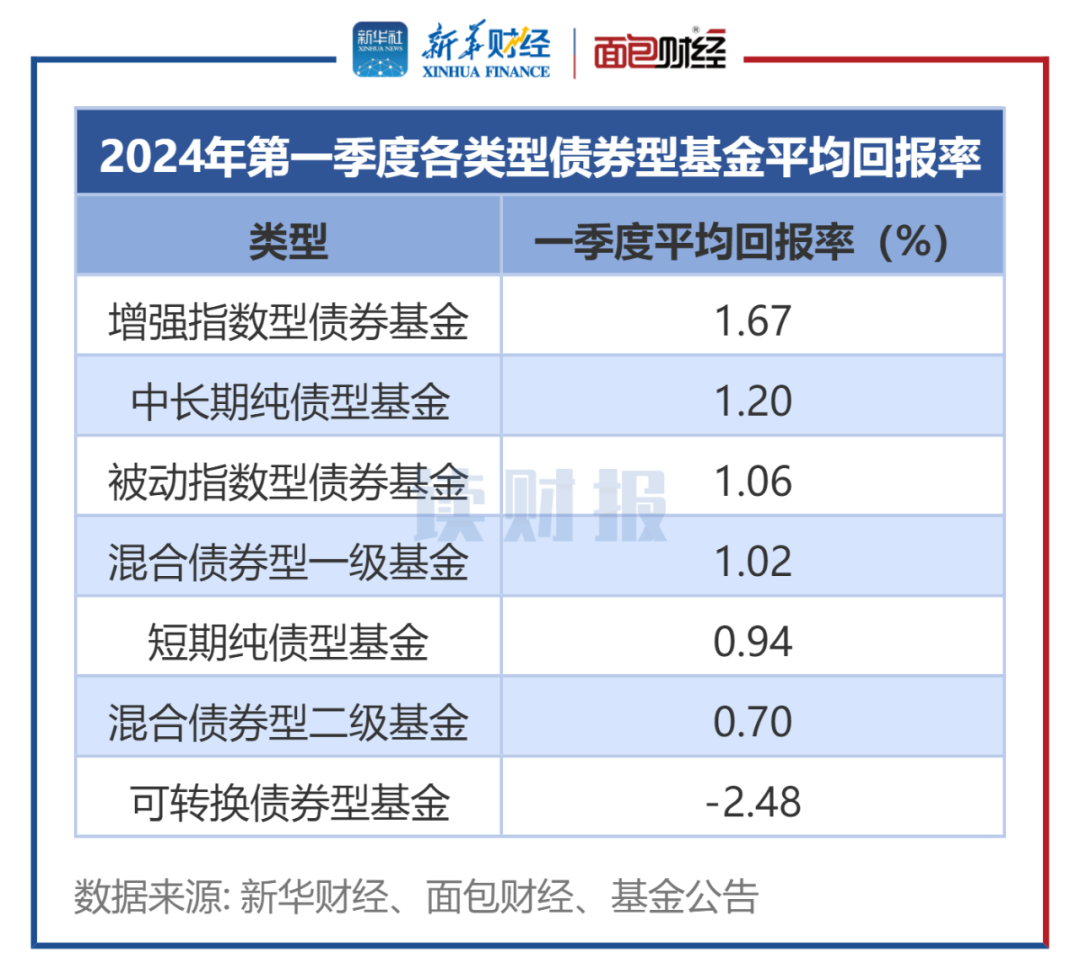 具体来看,西部利得鑫泓增强A、新华丰利A、工银可转债的一季度收益率在债券型基金中排名居前。此外,超180只产品出现净值下滑,前海开源可转债以亏损9.84%表现垫底。