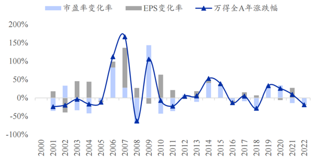 尤其是在A股,从指数整体收益率的分解来看,历年涨跌幅变化中,估值变化贡献占了很大比例。