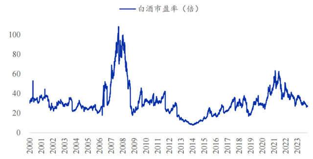 下图是白酒行业市盈率,2021年年初行业市盈率高达60倍,以至于2022、2023年像茅台这样优秀的公司,保持20%的增长,但是这两年还跌了12%。