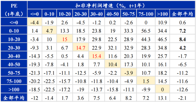 以第 4 行、第 6列的数值 29.8 为例,这个表示以市盈率 10 倍至 20 倍买入,第二年扣非业绩增速在30%至 40%,持有一年这个组合股价历史收益率中位数 29.8%。