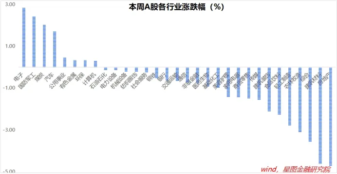 行业层面,电子(2.84%)、国防军工(2.43%)、煤炭、汽车等板块领涨;房地产(-4.72%)、建筑材料(-4.62%)、农林牧渔、轻工制造等板块跌幅靠前。