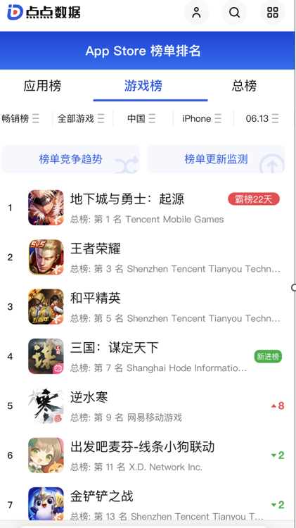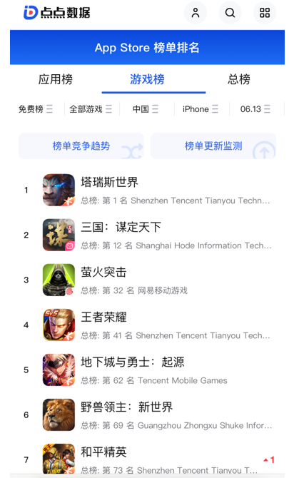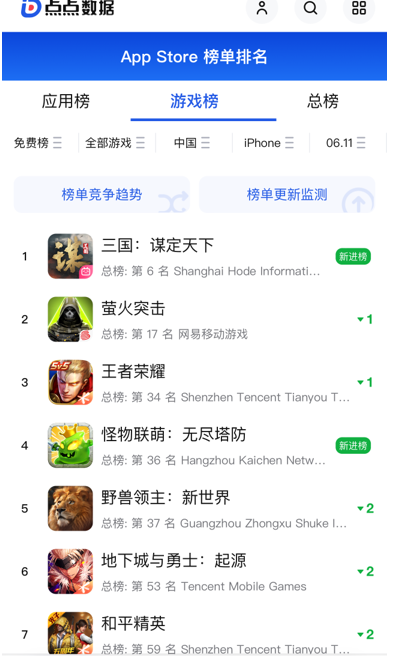 6月13日,《三国:谋定天下》开启公测。点点数据显示,该游戏公测当天位列中国地区App Store游戏免费榜总榜第二名。