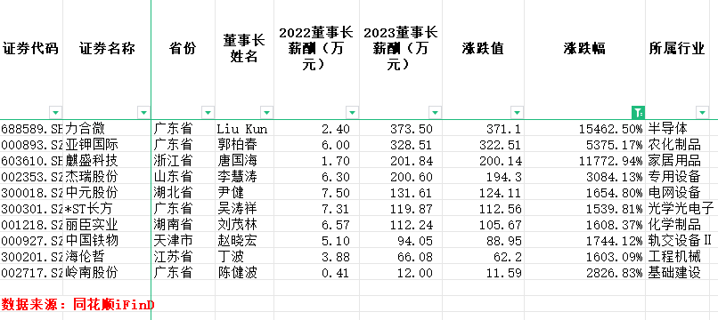 其中,当属力合微董事长Liu Kun年薪涨幅最大,年薪由2022年的2.4万元上涨至2023年的373.5万元,同比增长15462.5%。