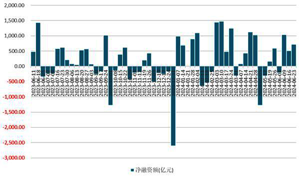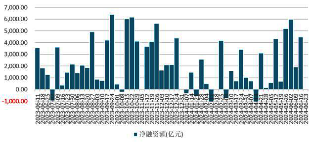 下周(06/24-06/30,下同),央行公开市场将有3,980亿元逆回购到期,其中周一至周五分别到期40亿元、860亿元、2,780亿元、200亿元、100亿元。此外周三(6月26日)还有50亿元央票互换到期。LPR报价维持不变。中国人民银行授权全国银行间同业拆借中心公布,2024年6月20日贷款市场报价利率(LPR)为:1年期LPR为3.45%(上月为3.45%),5年期以上LPR为3.95%(上月为3.95%)。本周,银行间质押式回购日均成交额61,154亿元,比上周减少8,273亿元。其中,R001日均成交额52,672亿元,平均占比86.1%;R007日均成交额6,026亿元,平均占比9.8%。从本周银行间主要回购资金利率周均值看,环比前值,普遍上行。其中,R001/R007/DR001/DR007周均值环比分别上行约16BP/10BP/16BP/9BP。本周,银行间主要回购资金利率收盘值,环比前值,普遍上行。6月21日本周末收盘,较6月14日上周末收盘,R001/R007/DR001/DR007环比分别上行约23BP/20BP/21BP/13BP。