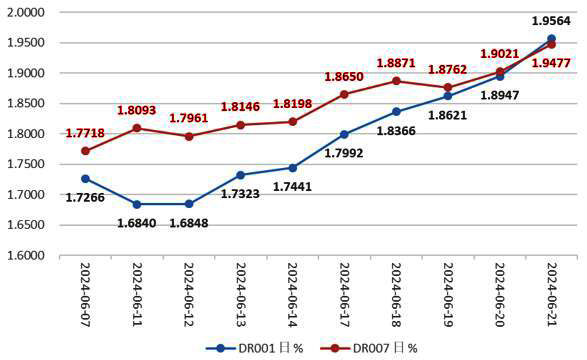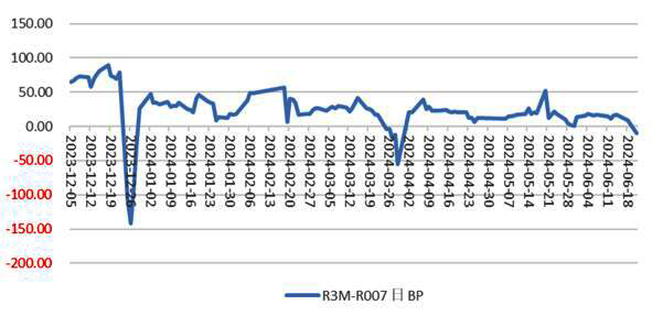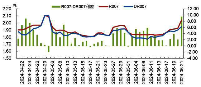 本周,R007与DR007走势有所相似,两者利差有所走阔。6月21日本周五两者利差为9.43BP,而上周末两者利差为1.82BP。