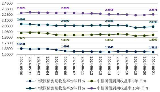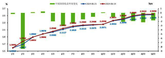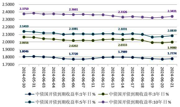 相对6月14日上周五,6月21日本周五,国债方面,各期限收益率环比上周,以下行为主(3Y、4Y、10Y有所上行),2Y下行明显。