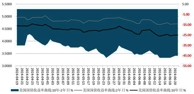 美国10Y-2Y国债收益率继续倒挂中,倒挂幅度较上周变浅。6月21日本周五倒挂至-45BP(上周五为-47BP)。2023年10月25日两者倒挂-13BP,接近2022年7月中旬的利差水平(-7BP);2023年7月3日,两者利差曾倒挂至-108BP,再创1981年9月19日以来的四十一年倒挂值新深度(当日-111BP)。