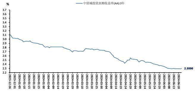 AA级城投债各期限收益率走势,环比上周,有所分化。本周五6月21日,相对与上周五6月14日,AA级城投债各期限收益率有所分化,短端、中端期限收益率以上行为主,其他期限收益以下行为主。3年期AA城投债收益率,6月21日本周五收至2.3006%,较6月14日上周五上行1.00BP,维持在2.50%关口之下;6月20日周四,报收2.2879%,创2002年6月18日以来的新低(2.2783%);2022年12月29日曾报收4.3254%,创出2020年11月底的两年多新高。
