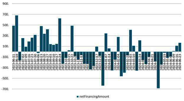 图22:产业债+城投债(wind口径)近一年净融资额变化情况(周)