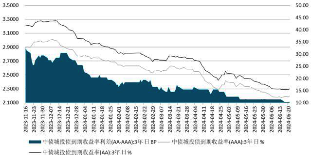 本周,3年期城投债到期收益率AA-AAA等级利差均值为10.39BP,而前值均值为11.39BP,利差有所收窄。
