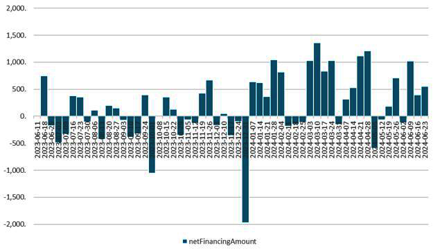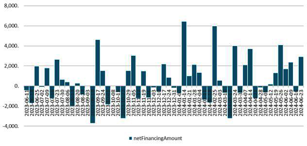 下周(6/24-6/30),发行计划方面,国债2只,共2,900.00亿元;地方债28只,共1,124.47亿元;政金债2只,共100.00亿元。