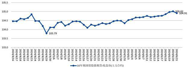02 二级市场(1)全周看,本周国债期货普遍上涨。全周来看,30年期主力合约涨0.43%,10年期主力合约涨0.15%,5年期主力合约涨0.11%,2年期主力合约涨0.05%。其中,10年期主力合约在4月23日报收历史高点104.85,之后连续回调至103.79后震荡向上;上周五6月14日报收104.76,本周周一至周四连续上行,并在6月20日周四创历史新高,报收105.20;6月21日本周五有所回落,报收104.91。