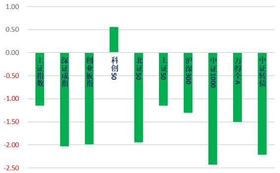 同期,本周权益市场指数多数下跌,万得全A下跌。其中,科创50上涨0.55%;上证指数、深证成指、创业板指、北证50、上证50、沪深300、中证1000分别下跌1.14%、2.03%、1.98%、1.93%、1.14%、1.30%、2.42%。全市场看,万得全A周下跌1.49%。