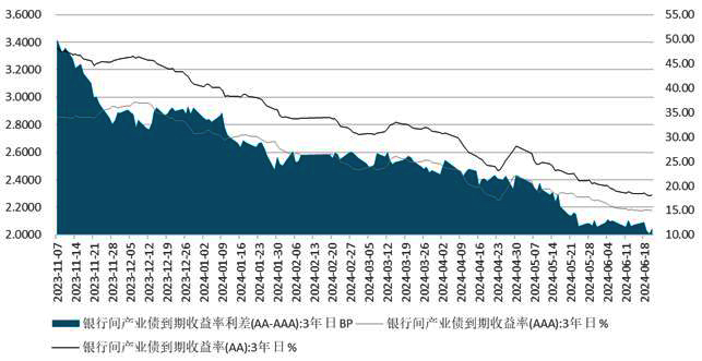本周,3年期银行间产业债到期收益率AA-AAA等级利差均值为11.52BP,而前值均值为12.09BP,有所收窄。