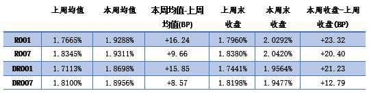 本周,银行间主要回购利率的均值/周末收盘值,环比上周均普遍上行,流动性总体保持合理充裕。