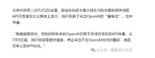 除了这个原因,我昨天还通过第一手资料来判断的:因为我在昨天找第一手资料的时候找到了【OpenAI称将采取额外措施 停止其不支持的国家和地区的API使用】这个消息: