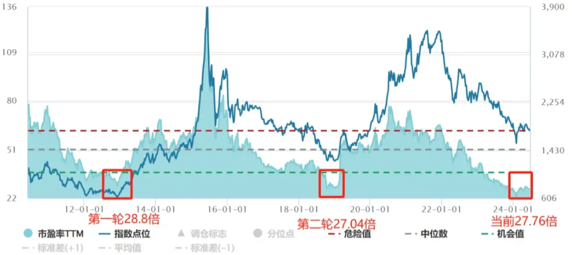 历史上创业板指市盈率最低的时候就是两轮熊市的底部,2012年12月586点时候28.8倍,2018年10月份1200点时候的27.04倍,事后来看,那两次都是一轮牛市的起点。