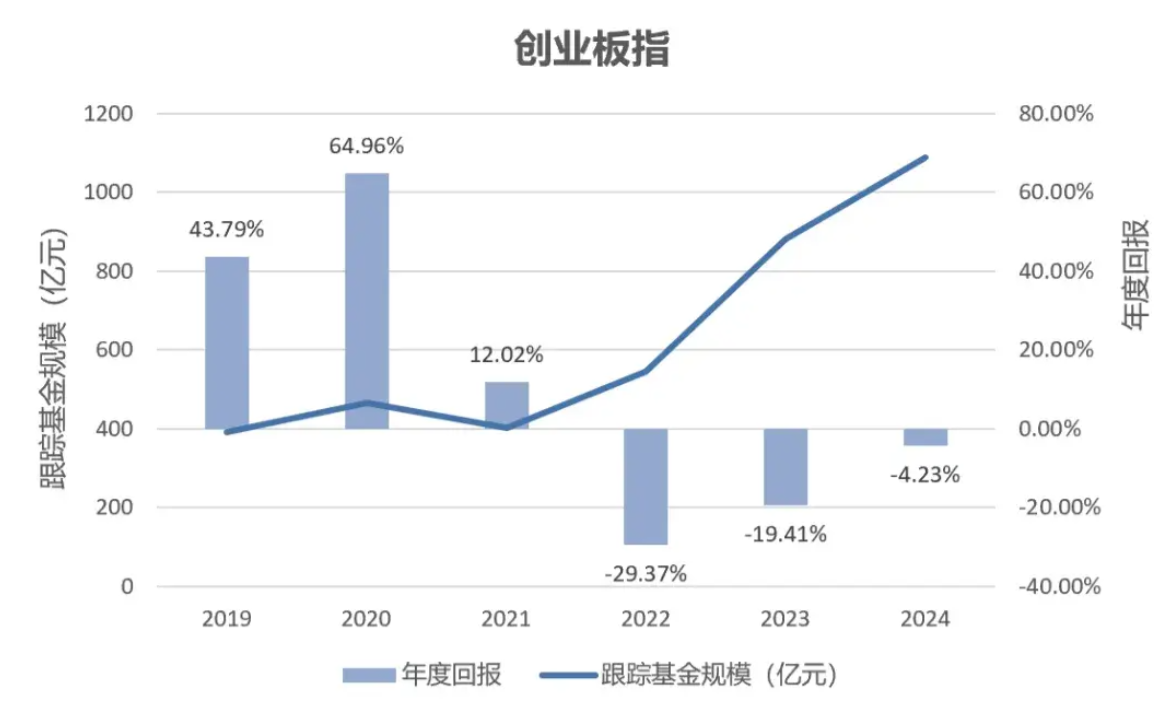 Wind数据显示,2021年年底,跟踪创业板指的基金规模为402.77亿元,之后伴随指数调整,基金规模反而大幅增长。
