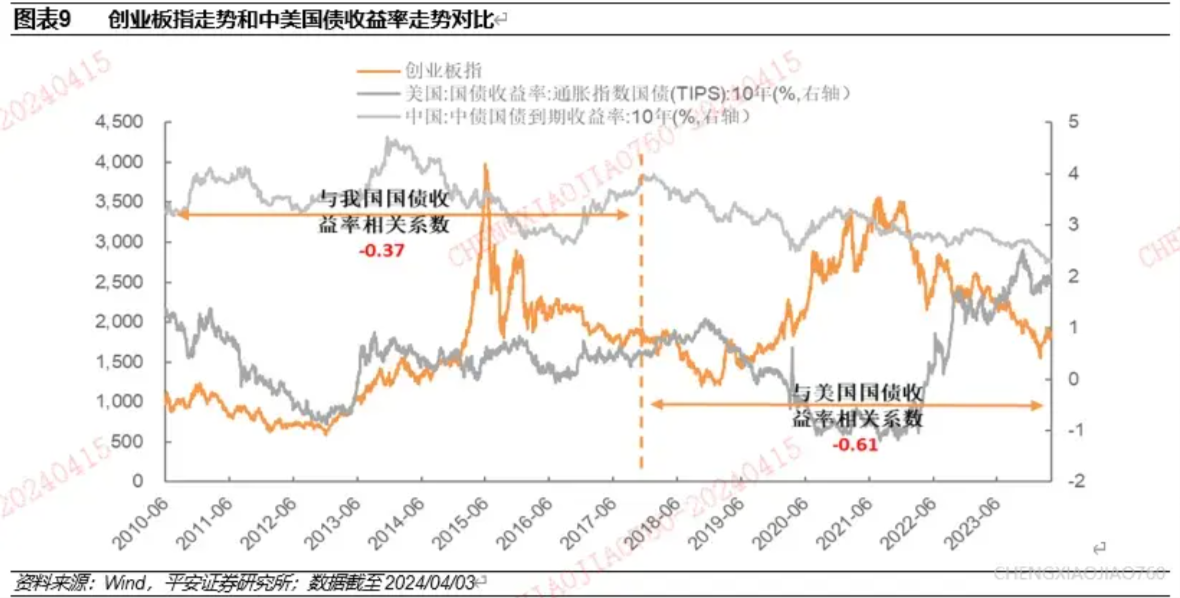 平安证券指出,2018年之前,创业板指走势和中国国债利率相关性较高;金融开放加速后,创业板指走势和美国国债实际利率呈明显负相关。