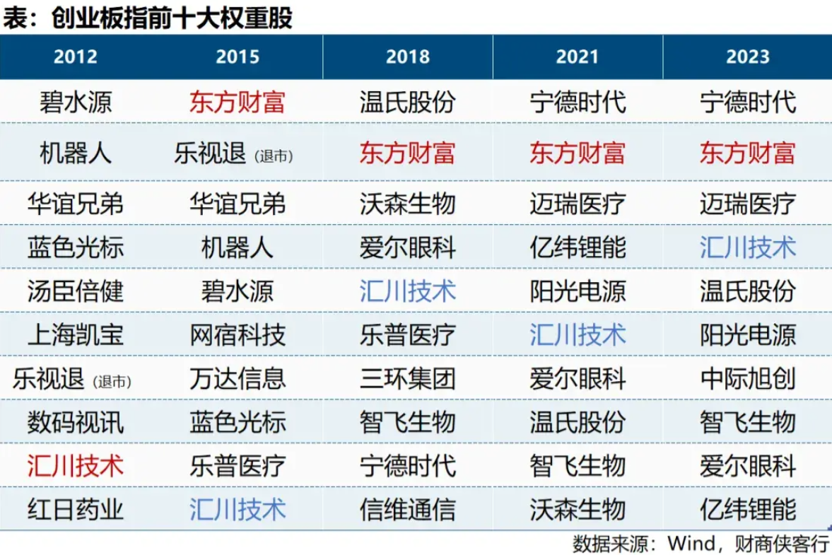 从创业板指的权重股更迭中可以发现,当前创业板指的前十大权重股中,2013年以来仍然列席的只有东方财富和汇川技术,其它权重股均已沧海桑田。