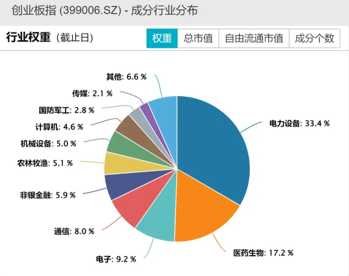目前,创业板指的权重主要集中在申万一级行业当中的电力设备、科技TMT、生物医药三大板块。