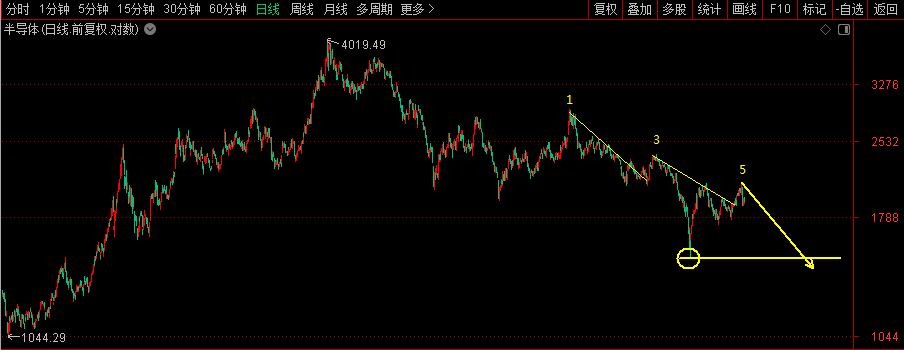 半导体指数在2023年4月6日步入熊市下半场,按趋势运动规律,下半场又分为1、2、3、4、5五个涨跌阶段。其中,1、3、5单数为顺势的下跌,2、4偶数为逆势的反弹。