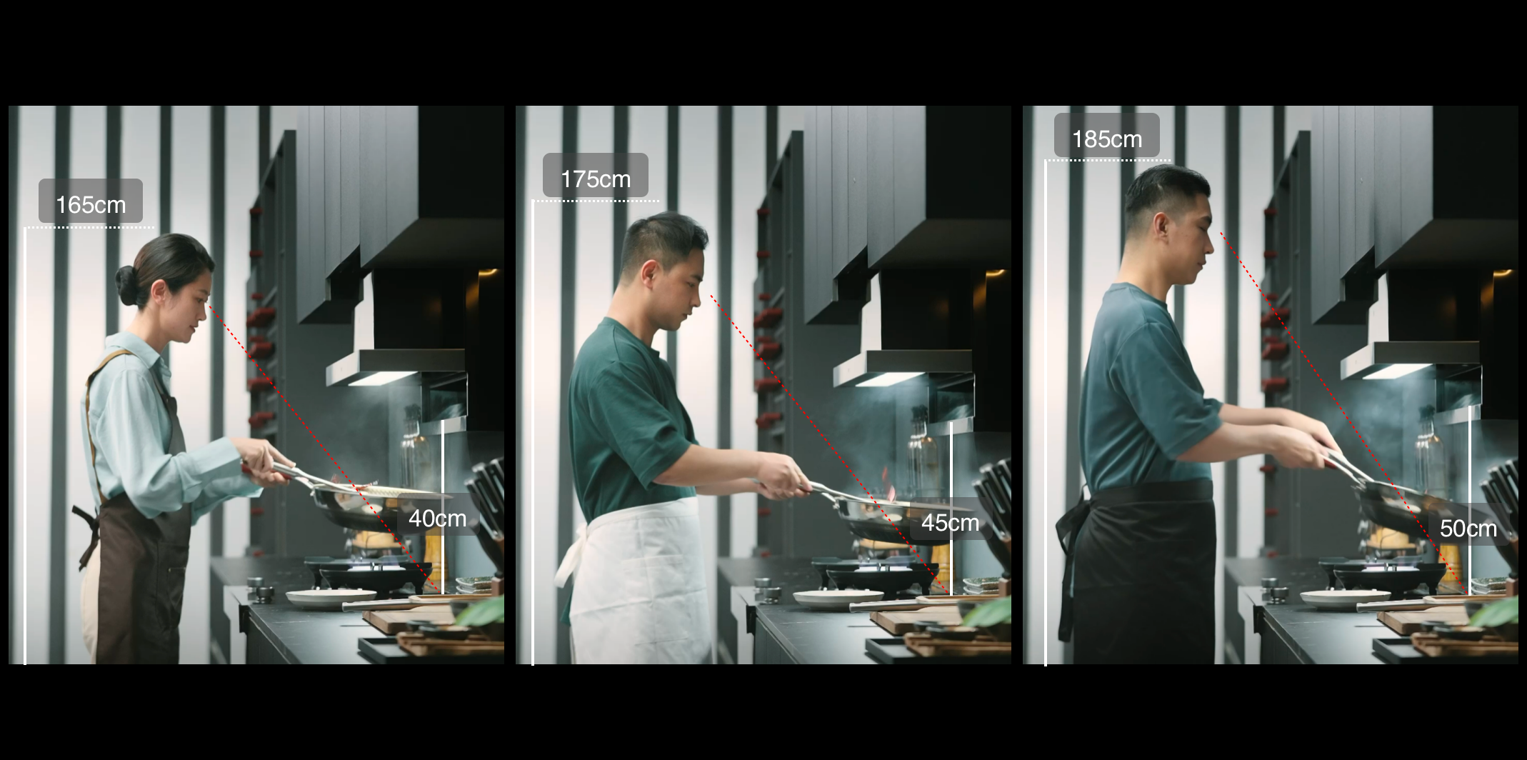 集成烹饪中心的双级升降与无级升降,一劳永逸地解决了烟机易碰头、烟源难捕捉与机身做薄的难题,同时做到烹饪千人千面——无论烹饪者高矮、烹饪油烟大小,都可以实现自适应,全域净吸。
