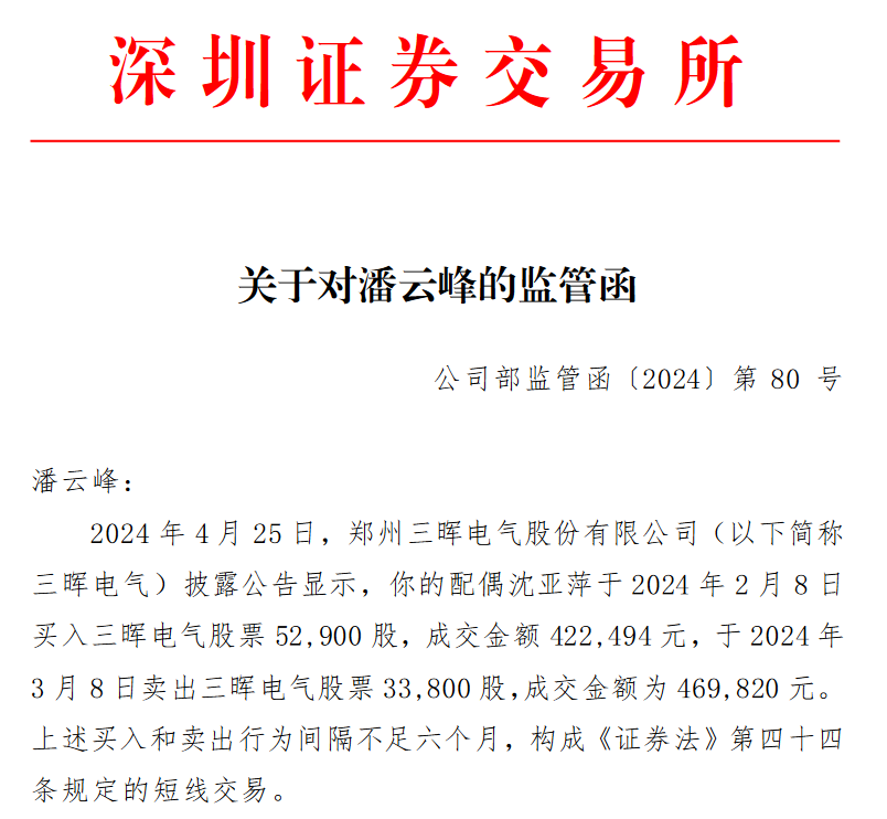 2024年4月,三晖电气发布公告称,因配偶买卖公司股票,构成短线交易,公司监事潘云峰收到中国证监会河南监管局下发的警示函。
