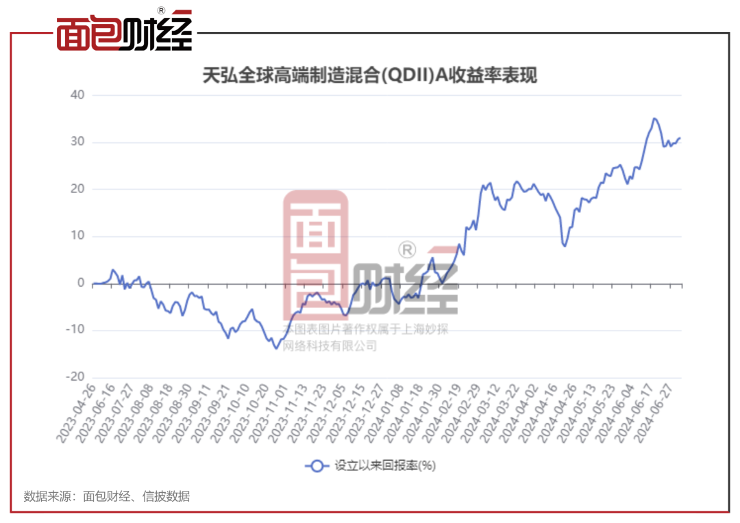 截至2024年7月2日,天弘全球高端制造混合(QDII)A年内净值上涨29.64%,跑赢业绩比较基准超过25个百分点,同类排名3/96,表现较为突出。