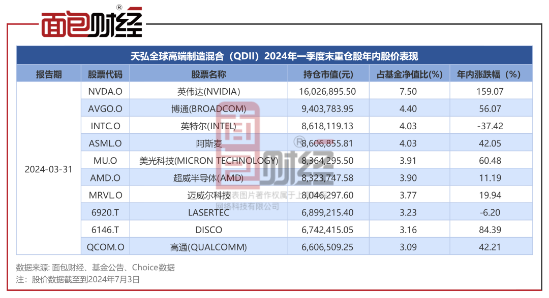 面包财经梳理公开资料显示,2024年一季度末,天弘全球高端制造混合(QDII)持仓主要配置在美国市场,重仓股包括英伟达、博通、英特尔、阿斯麦等企业。
