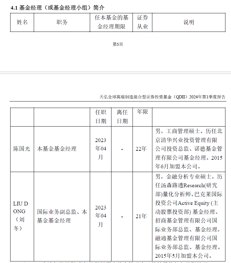 天弘全球高端制造混合(QDII)的基金经理为陈国光、LIU DONG(刘冬)。