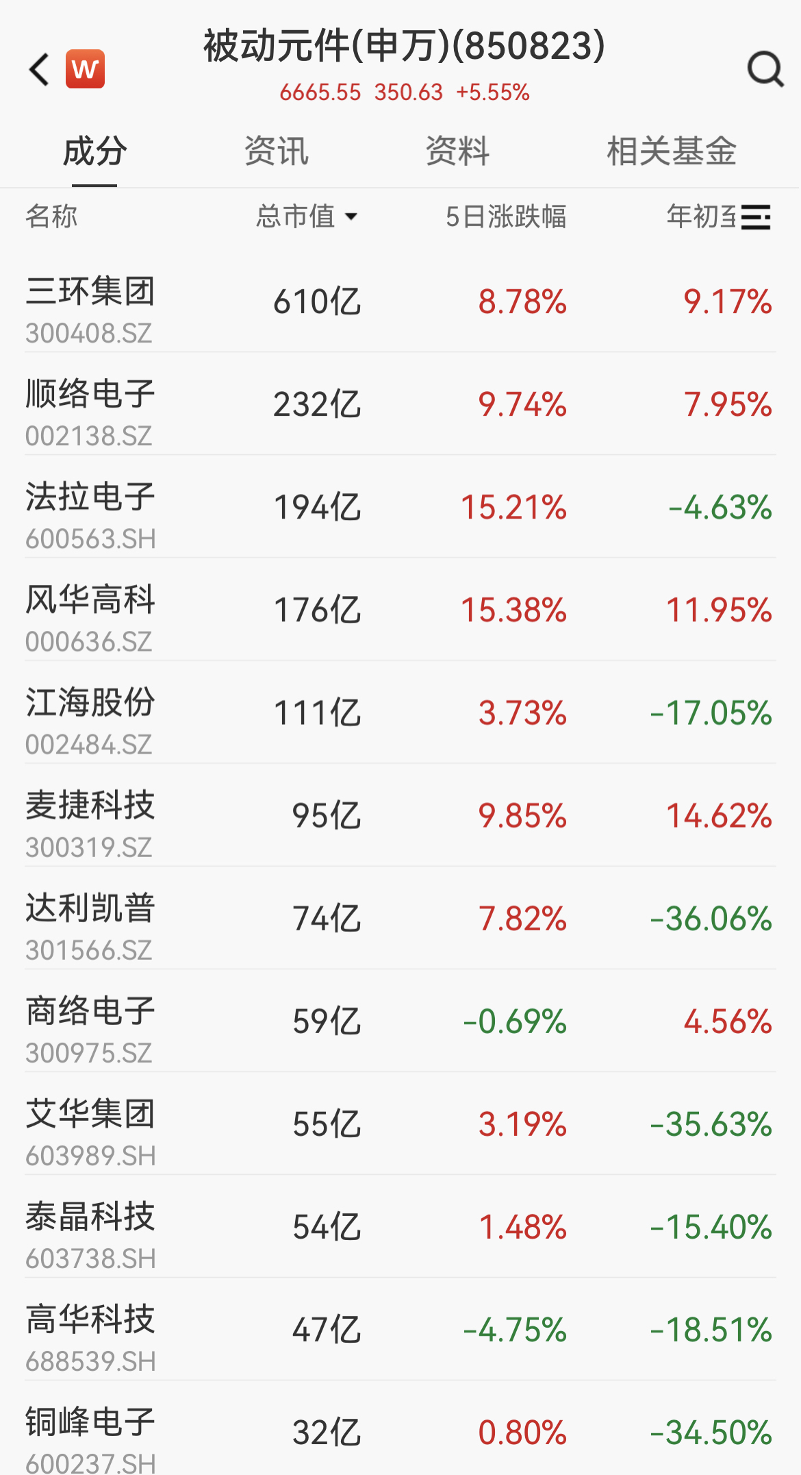 受此消息影响,A股被动原件板块连日走强,风华高科、法拉电子、顺络电子、三环集团等个股出现了一定的涨幅。